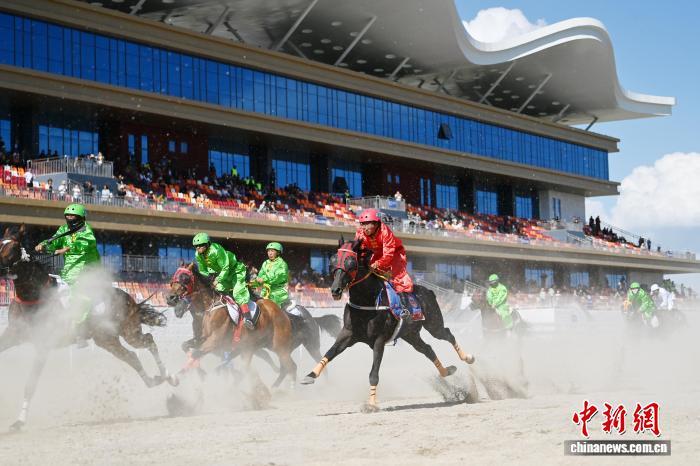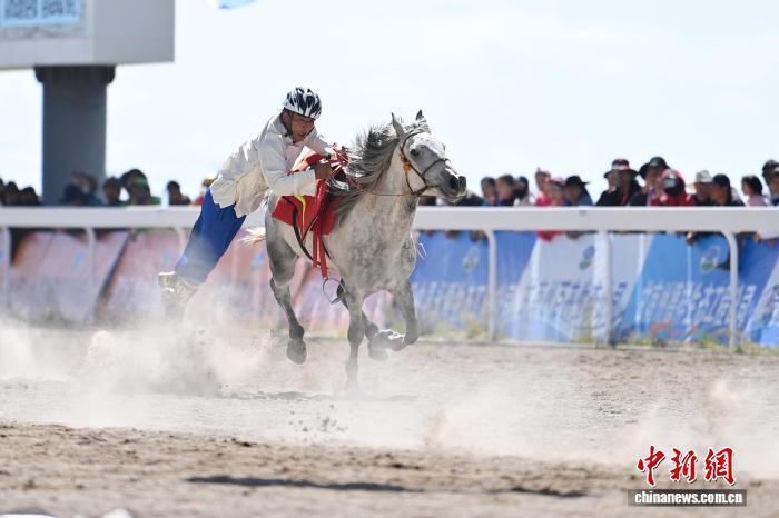 圖為賽馬選手在格薩爾賽馬中心比賽中。中新社記者 九美旦增 攝