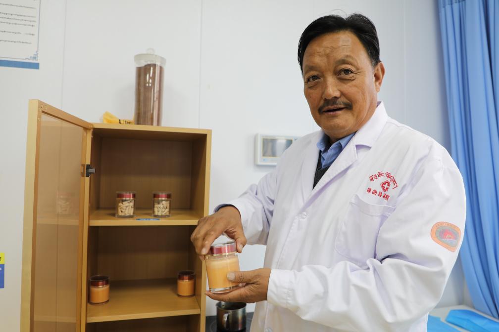 10月29日,甘南藏醫(yī)藥代表性傳承人看照加展示藏醫(yī)院制作的院內(nèi)制劑。新華社記者梁軍攝