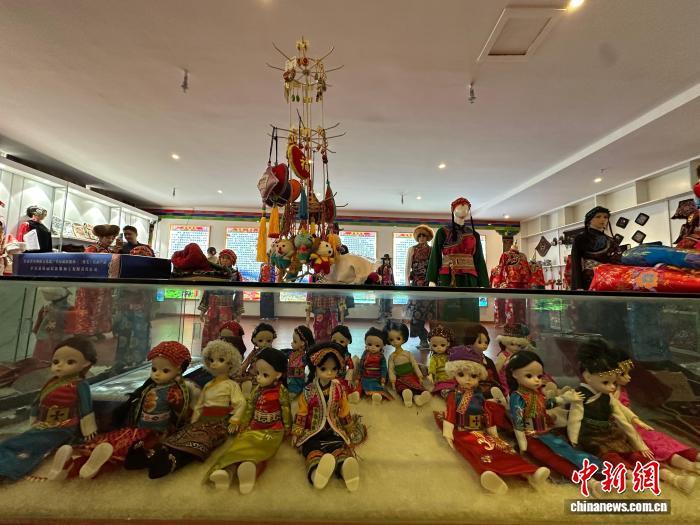 2月1日,殷保朝工作室里展陳的承載著“三格毛”服飾文化的布偶和掛件伴手等文創(chuàng)新品。中新社記者 馮志軍 攝