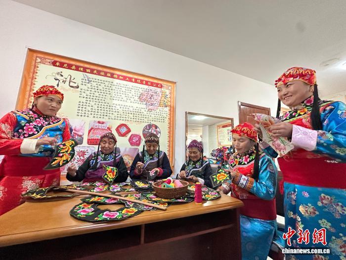 2月1日,在殷保朝的工作室里,繡娘們正在趕制“三格毛”服飾。中新社記者 馮志軍 攝