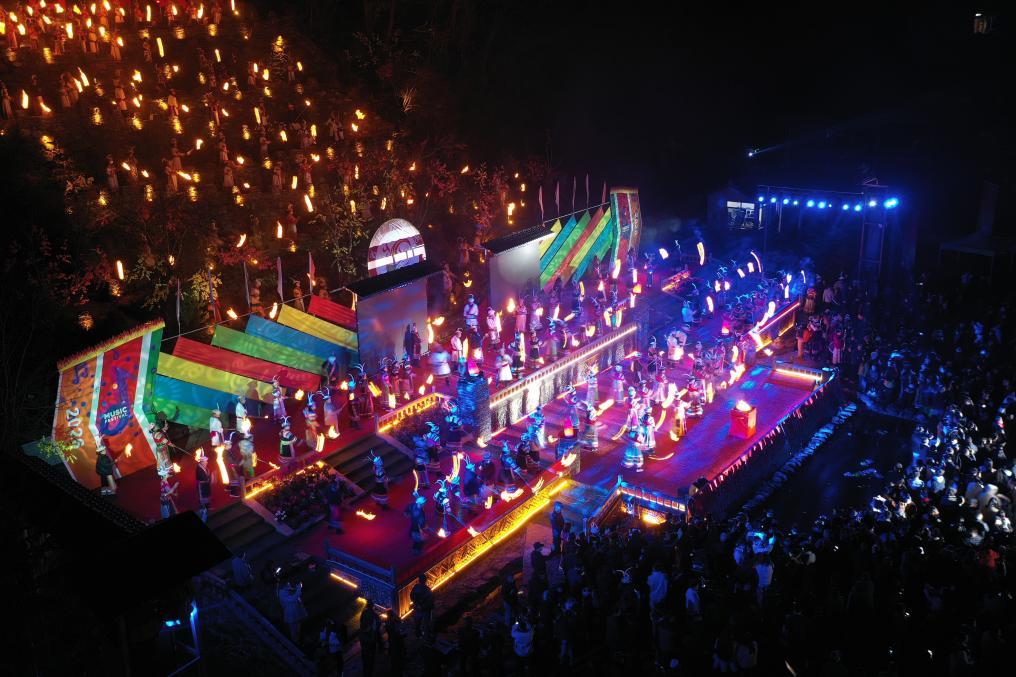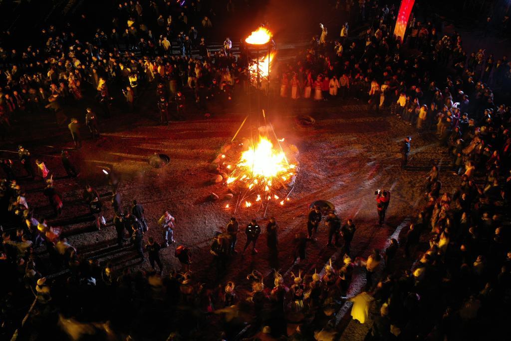 這是3月3日在甘肅省隴南市文縣鐵樓藏族鄉(xiāng)草河壩村拍攝的《吉祥的火把》主題演繹現(xiàn)場(chǎng)(無(wú)人機(jī)照片)。新華社記者 范培珅 攝