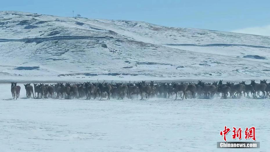 圖為白唇鹿種群在黃河冰面遷徙。加羊多杰 攝
