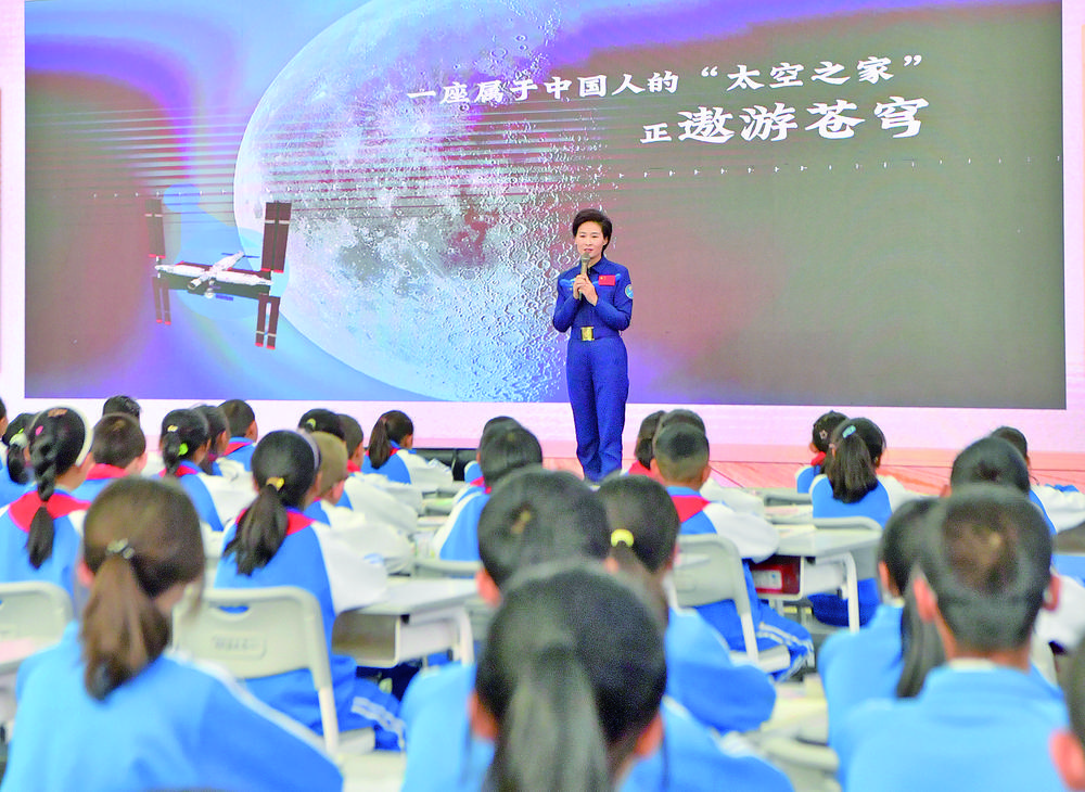 中國(guó)首位女航天員劉洋正在為同學(xué)們授課。記者 王偉才 李娜 攝