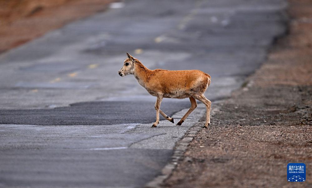 在可可西里,一只雌性待產(chǎn)藏羚羊通過(guò)青藏公路(2023年5月28日攝)。新華社記者 張宏祥 攝