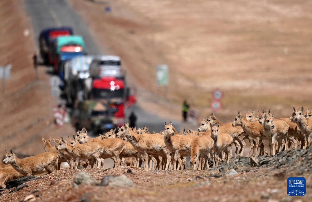 5月27日,藏羚羊在可可西里五道梁地區(qū)通過(guò)青藏公路。新華社記者 張龍 攝