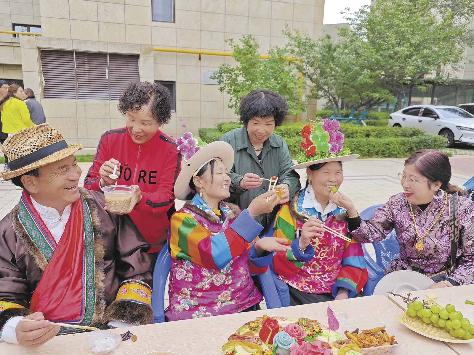 60多位來自漢族、藏族、撒拉族等不同民族的群眾身著特色民族服飾歡聚一堂,大家紛紛端來熱氣騰騰的拿手好菜。不一會(huì)兒,色香味俱全的佳肴就擺滿了一張張長(zhǎng)桌。蒙古族居民布音達(dá)萊端起一盤散發(fā)著濃濃奶香味的草原傳統(tǒng)美食奶皮子,熱情邀請(qǐng)一旁的藏族居民扎西太品嘗?!昂贸?,好吃?!痹魈穱L后,豎起大拇指贊不絕口。