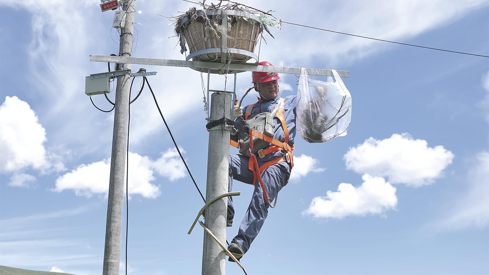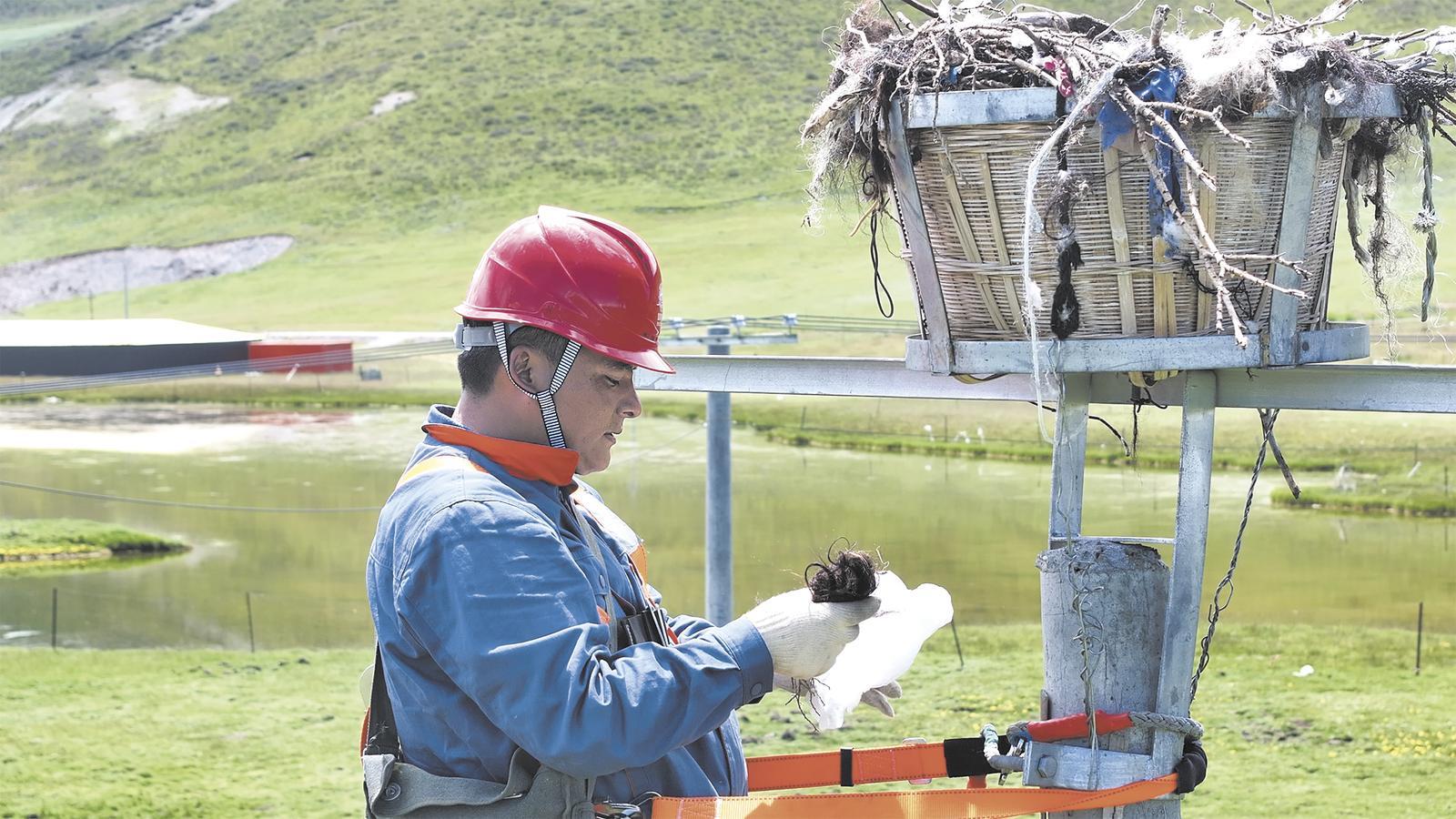 國(guó)網(wǎng)青海電力工作人員為“生命鳥(niǎo)巢”做好“物業(yè)服務(wù)”。