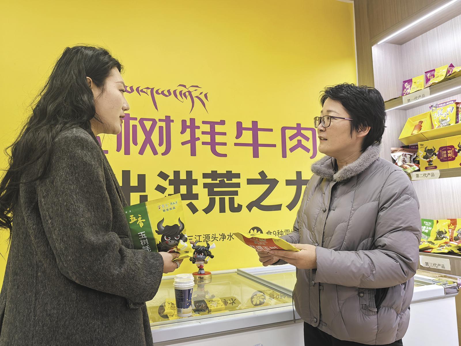 周振霞(右)在青海首農玉樹供應鏈發(fā)展有限公司體驗店了解產品更新情況。