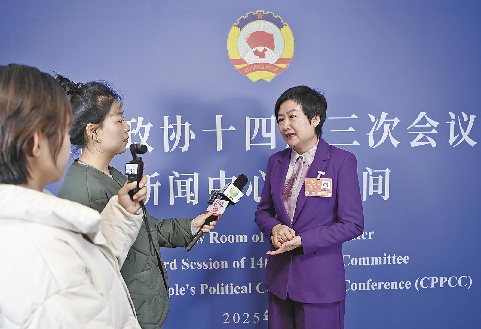 住青全國(guó)政協(xié)委員李青在采訪中心介紹提交提案情況。記者 祁國(guó)彪 攝