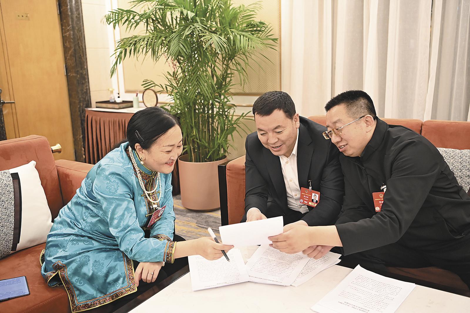 住青全國(guó)政協(xié)委員金花、韓文林、鄂崇榮一起交流學(xué)習(xí)。記者 祁國(guó)彪 攝