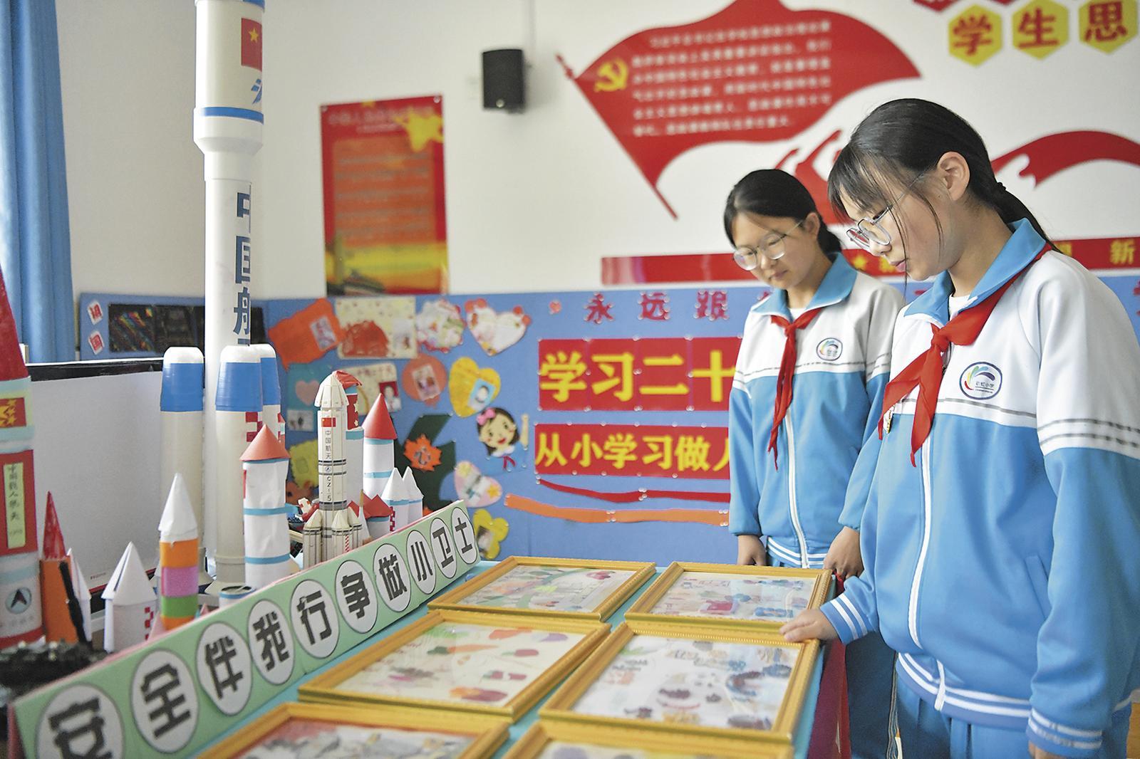思政課后的大課間,學生來到學校的“思政工作室”參觀。教室里,“童心永向黨 爭做好少年”“熱愛祖國 熱愛家鄉(xiāng)”“鑄牢中華民族共同體意識”等主題的粘貼畫、石頭畫、手抄報精美絕倫,吸引大家駐足欣賞。