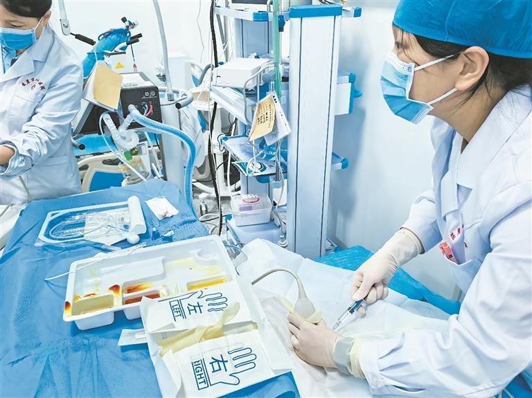 浙江臺州援青醫(yī)生徐盼盼正全神貫注為患者穿刺。記者 冉志敏 攝