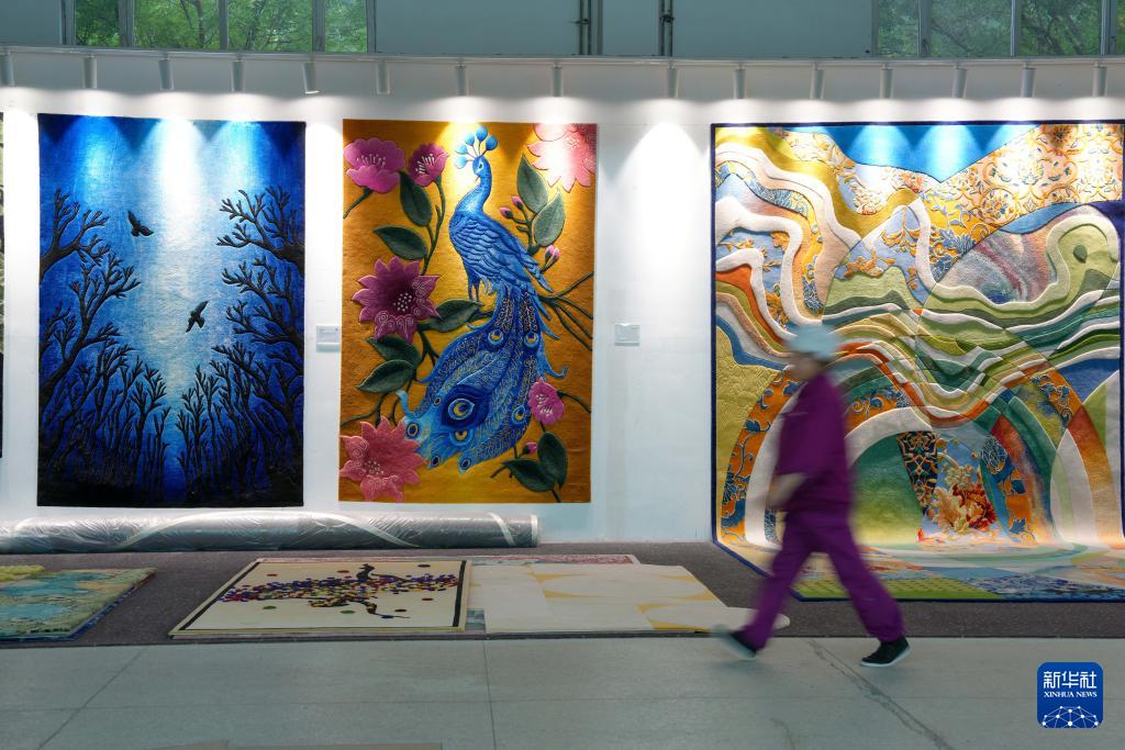 9月27日,在西寧市圣源地毯集團(tuán)有限公司生產(chǎn)車間,一名操作工從展示的藏毯前走過。新華社記者 杜笑微 攝