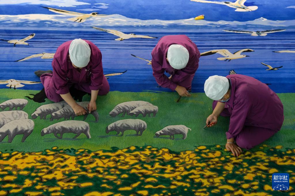 9月27日,在西寧市圣源地毯集團(tuán)有限公司生產(chǎn)車間,三名操作工在制作藏毯。新華社記者 杜笑微 攝