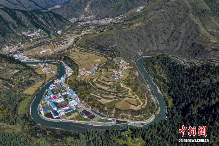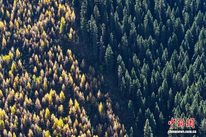10月16日,航拍位于青海省果洛藏族自治州班瑪縣境內(nèi)的瑪可河林區(qū)秋景如畫。(無人機(jī)照片)中新社記者 馬銘言 攝