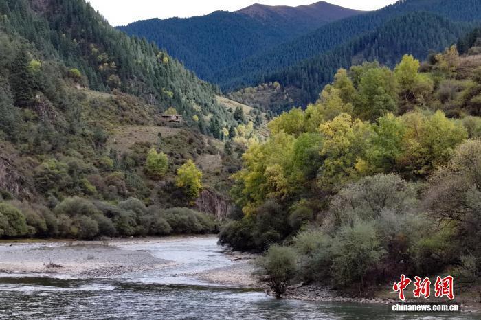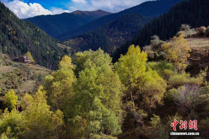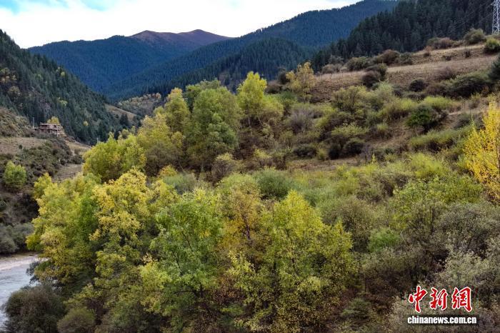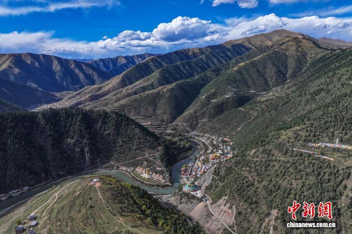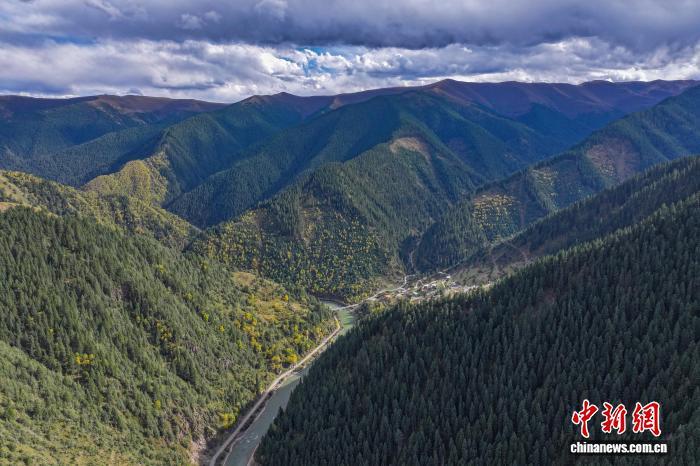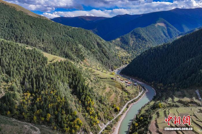 10月16日,航拍位于青海省果洛藏族自治州班瑪縣境內(nèi)的瑪可河林區(qū)萬木蔥蘢,秋景如畫。(無人機(jī)照片)中新社記者 馬銘言 攝