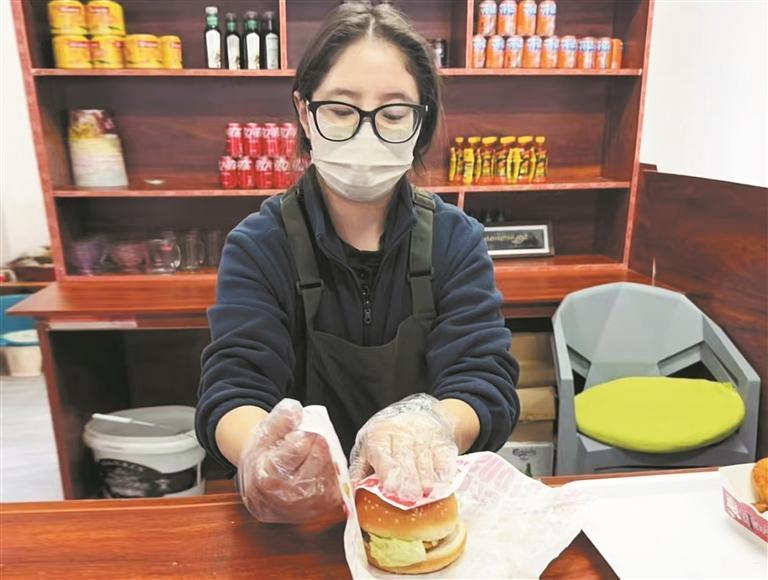 “牦牛肉是我們當(dāng)?shù)厝俗類鄢缘氖澄?,把它夾在漢堡里孩子們更愛吃。集散基地里的游客和顧客都喜歡嘗一嘗,生意真不錯(cuò)?!比试隼吲d地說。