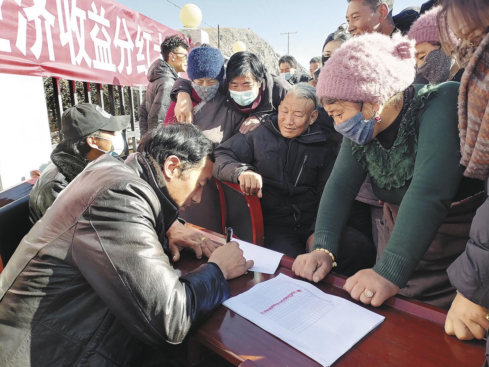 與分紅同場(chǎng)開(kāi)展的,還有為全村65歲以上老人提供的免費(fèi)健康體檢。村醫(yī)昂文卓瑪帶領(lǐng)三名隊(duì)員,貼心地為行動(dòng)不便的老人進(jìn)行入戶(hù)體檢。“以前看病、體檢要到二十多公里外的市區(qū),現(xiàn)在分紅現(xiàn)場(chǎng)就能體檢,健康服務(wù)都送到了家門(mén)口?!币晃焕先藙偝橥暄?,便豎起了大拇指。