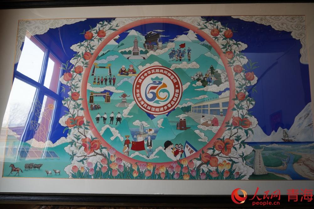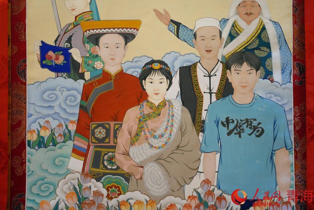 以民族團結(jié)為主題的唐卡作品。人民網(wǎng)記者 況玉攝