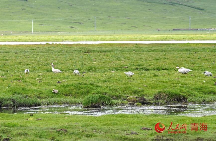 盛夏,斑頭雁在隆寶濕地覓食。人民網(wǎng)記者 甘海瓊攝