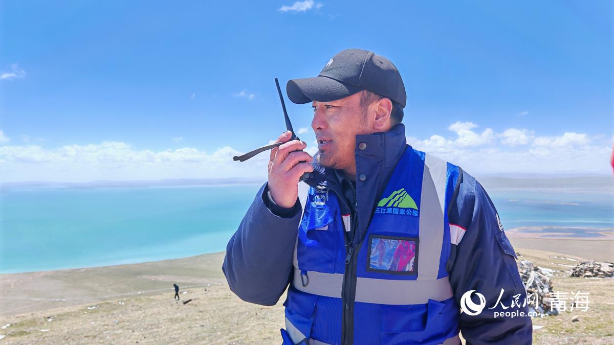 三江源國(guó)家公園黃河源園區(qū)的生態(tài)管護(hù)員格日杰布在海拔4610米的措哇尕則山頂峰巡護(hù)。人民網(wǎng)記者 楊啟紅攝