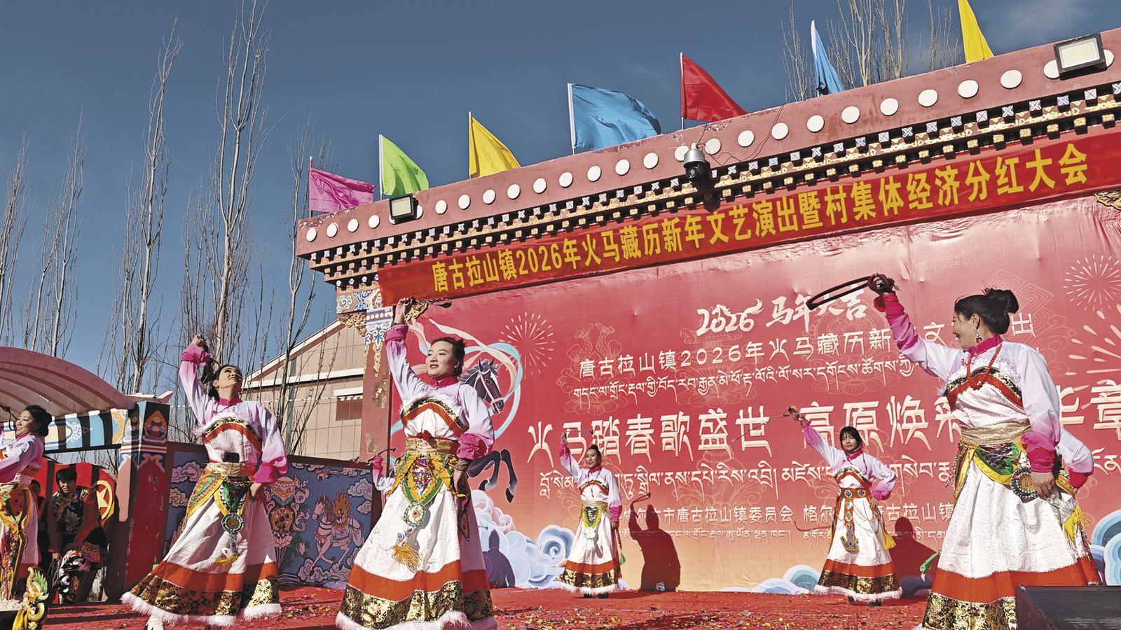 2月5日,海西蒙古族藏族自治州格爾木市唐古拉鎮(zhèn)洋溢著濃厚的節(jié)日氛圍,2026年火馬藏歷新年文藝演出暨村集體經(jīng)濟(jì)分紅大會(huì)在這里舉行。村民身著絢麗民族服飾,以一場(chǎng)精彩紛呈的文藝盛宴共迎佳節(jié)。隨后舉行的村集體經(jīng)濟(jì)分紅大會(huì),將活動(dòng)推向高潮。2025年,唐古拉鎮(zhèn)全鎮(zhèn)7個(gè)行政村集體經(jīng)濟(jì)收入338.25萬元,同比增長(zhǎng)21.53%。集體經(jīng)濟(jì)持續(xù)壯大,讓發(fā)展成果惠及每位村民,切實(shí)提升了人民群眾的獲得感、幸福感與安全感。