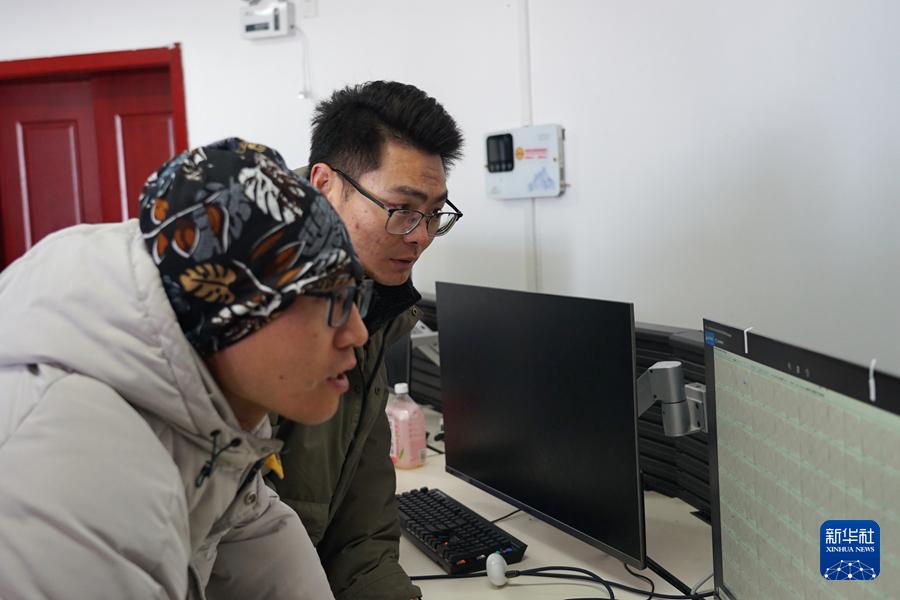 1月29日,AIMS望遠鏡觀測員王城森(右)與同事馮宇飛在工作中交流。新華社記者 陳杰 攝