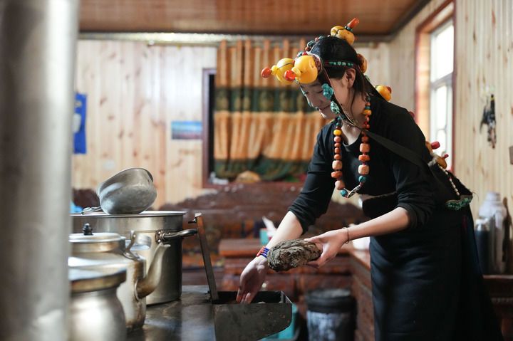 1月30日,在青海省玉樹(shù)藏族自治州雜多縣結(jié)多鄉(xiāng)達(dá)俄村,牧民塔加的女兒在鐵爐里添加牛糞。新華社記者 張龍 攝