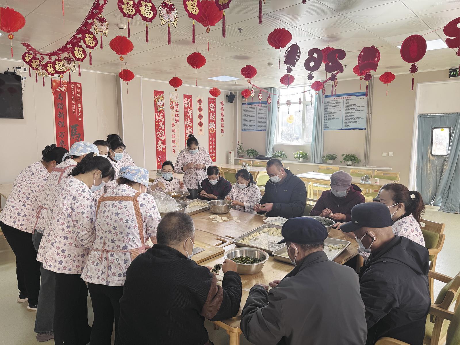 院長路智勇與敬老院護(hù)理人員和老人們一起包餃子。