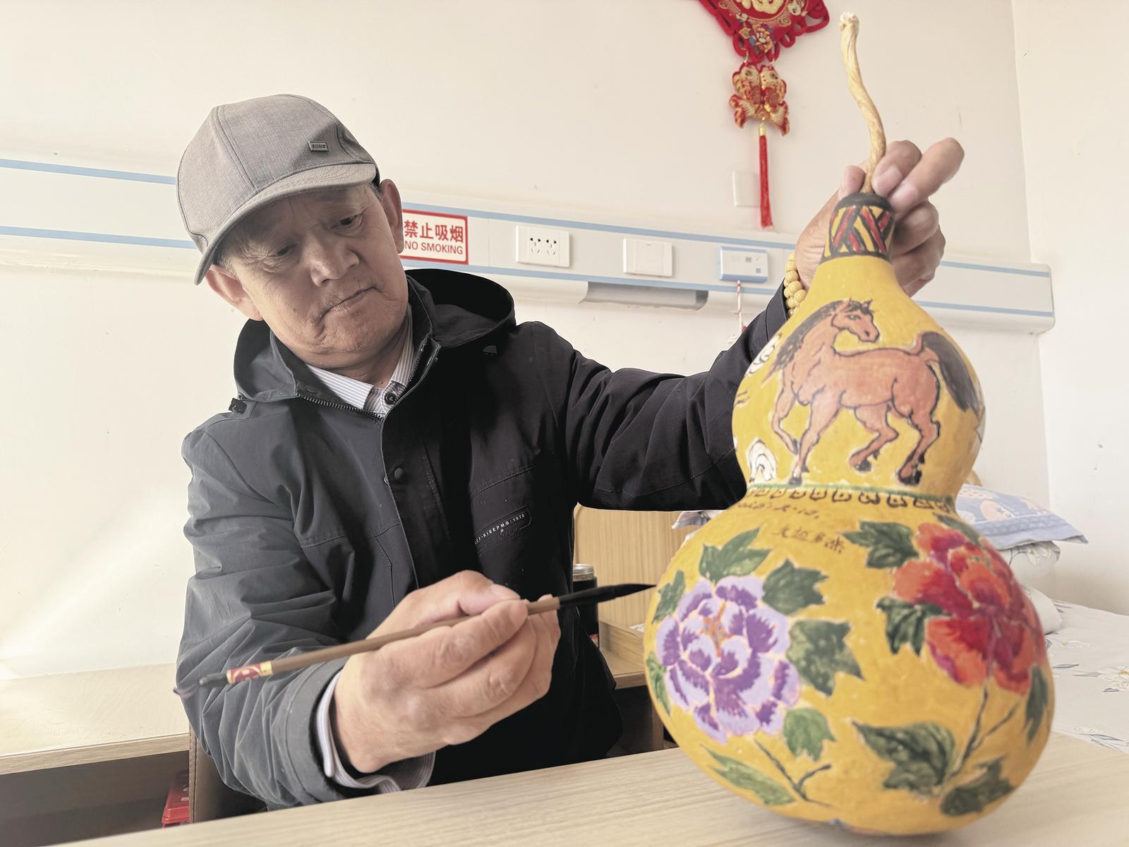院中老人為迎接春節(jié)繪制彩繪葫蘆。記者 劉娟娟 攝