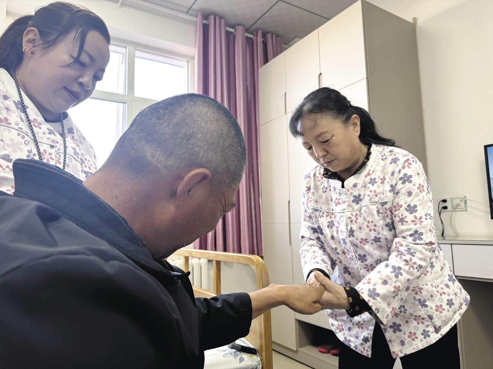 護(hù)理員為院中老人按摩。