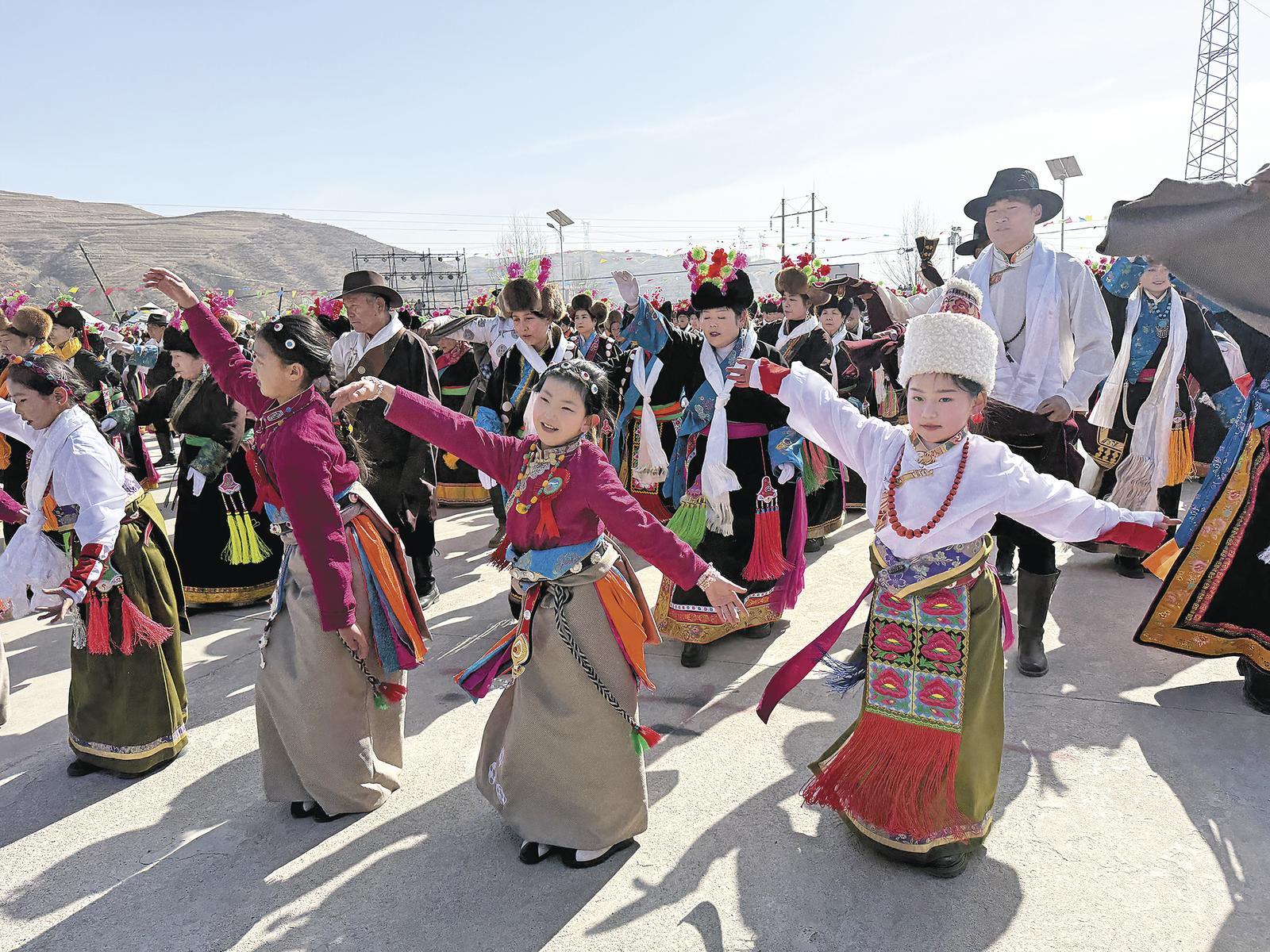 圖為村民身著宗喀傳統(tǒng)民族服飾共舞現(xiàn)場。記者 李延平 攝