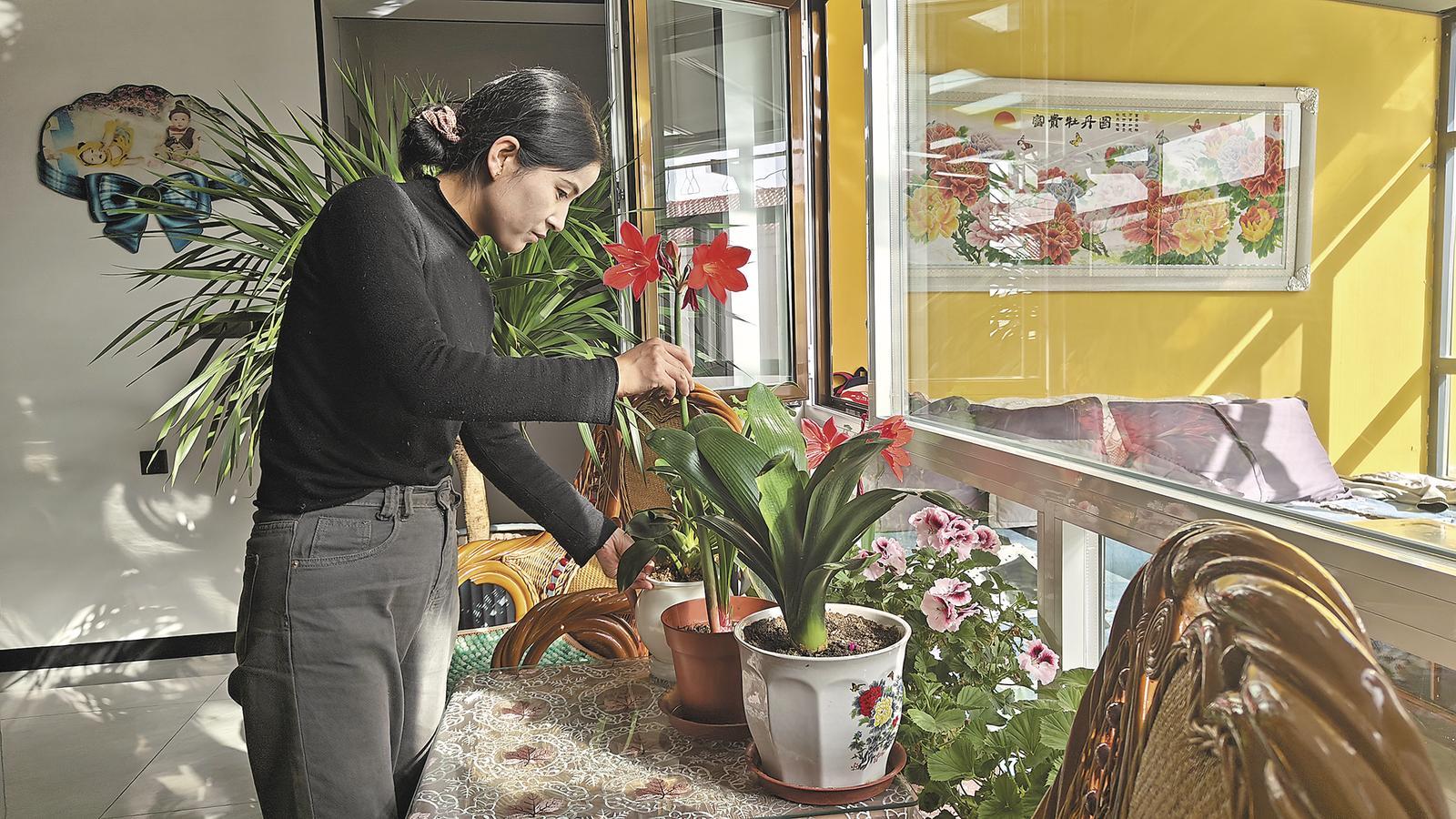 趙國(guó)梅正在查看家里的花。記者 楊紅霞 攝