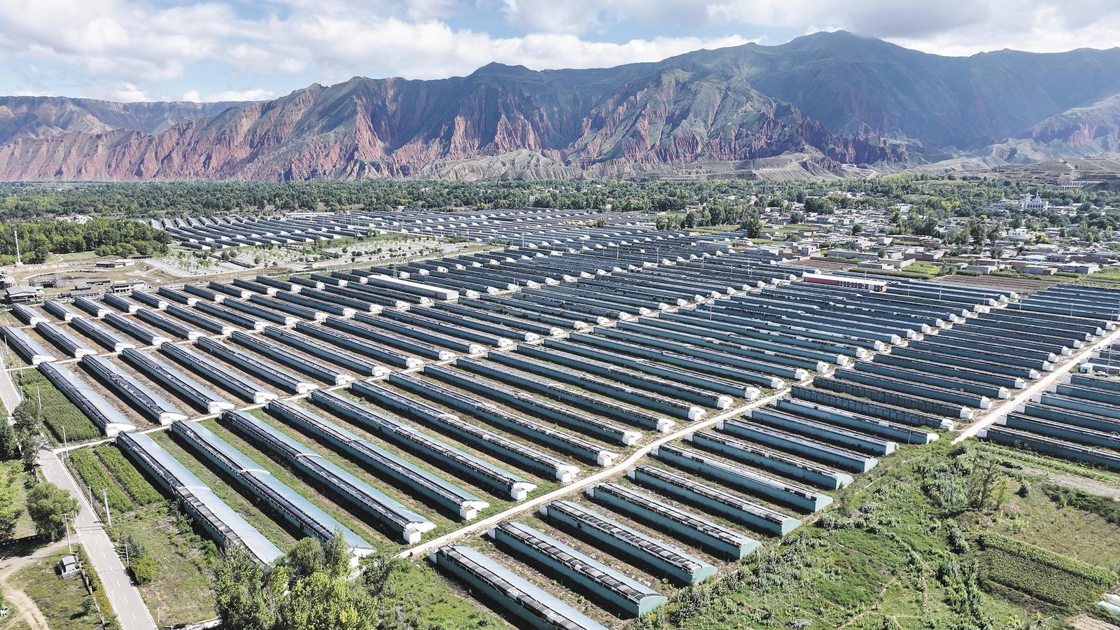 沐浴在陽光下的一排排溫室大棚。