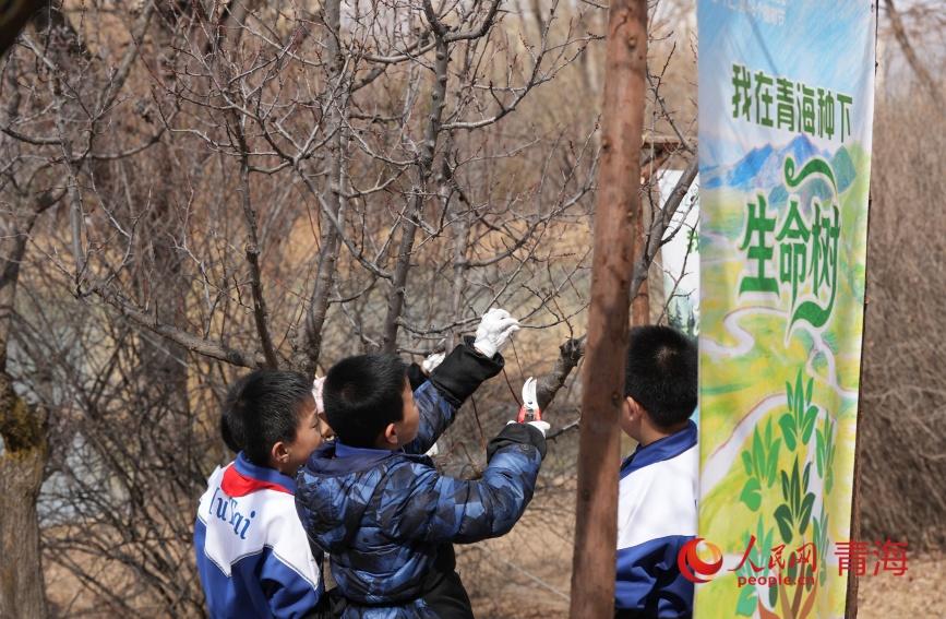 學生給樹木修剪枯枝。人民網(wǎng)記者 甘海瓊 攝