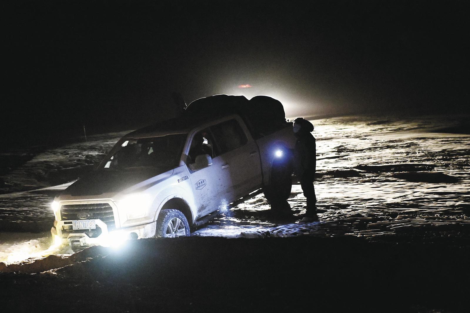 車陷進(jìn)冰河是常事。有一回,幾輛車在河谷里折騰到半夜,零下三十多攝氏度的寒風(fēng)中換輪胎,手凍得握不住扳手。第二天天亮才發(fā)現(xiàn),車隊停在一片大湖的淺灘上,背后就是布喀達(dá)坂峰,雪山近在咫尺。