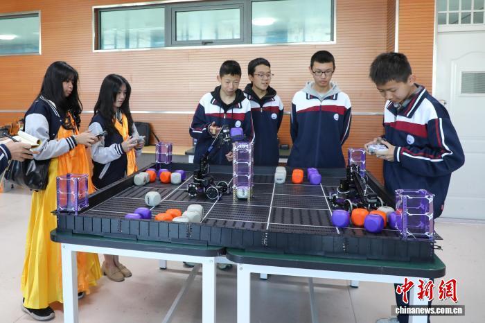 圖為香港學生(左一、左二)與果洛西寧民族中學學生共同操作APM編程機器人。馬銘言 攝