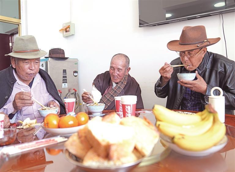 記者在現(xiàn)場看到,30多位老人圍坐一桌,悠閑享用著午餐。桌上,當(dāng)?shù)靥厣撅?、黃南饃饃、酸奶搭配新鮮水果,營養(yǎng)均衡,符合老年人飲食需求。溫馨的用餐氛圍里,老人們臉上滿是愜意與滿足。