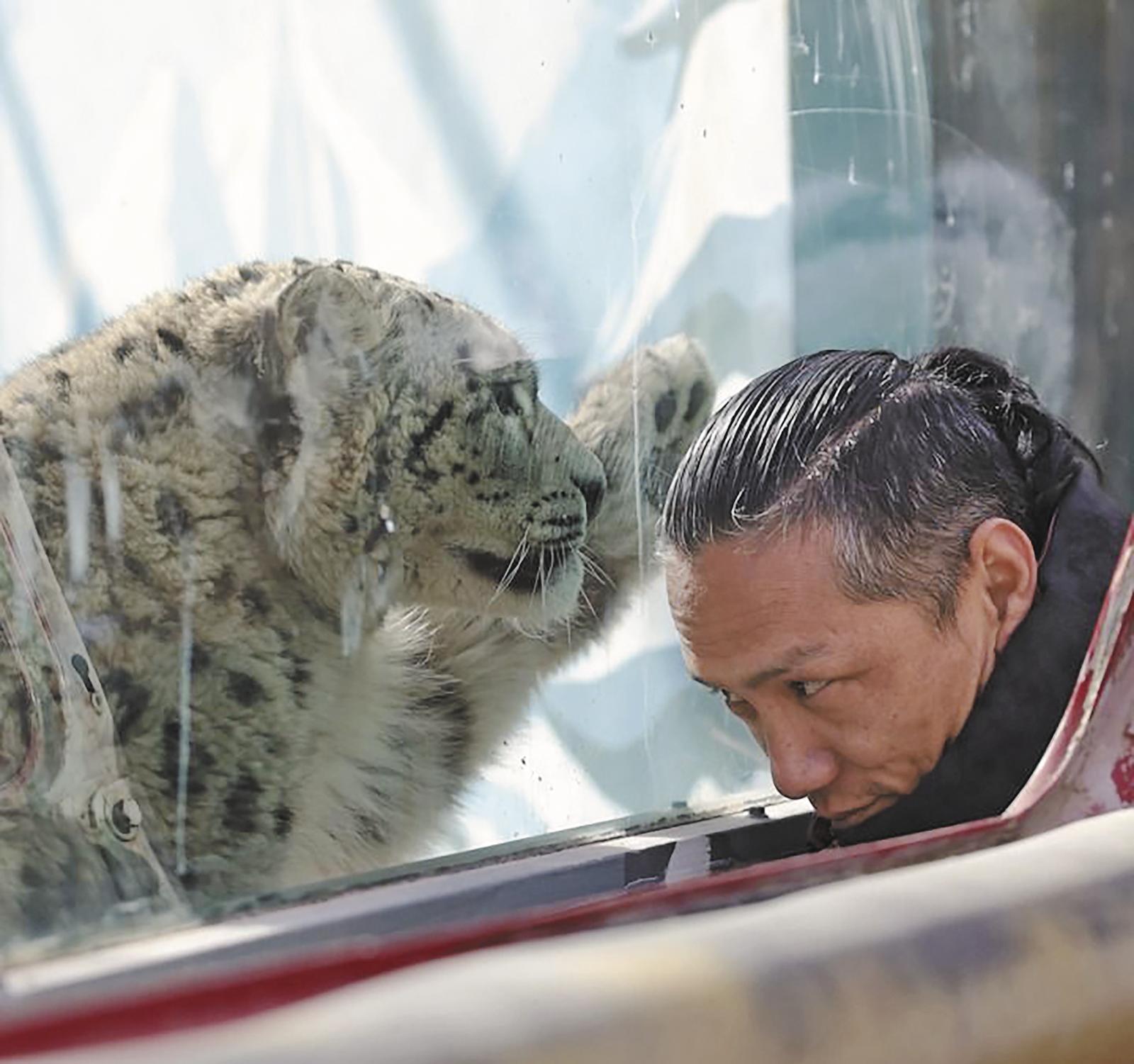 雪豹“凌小蟄”在雪豹館和獸醫(yī)趙海龍隔窗互動。記者 李寧 攝