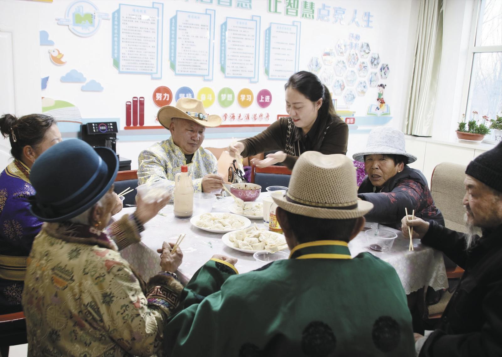 社區(qū)工作人員和老人們圍坐一起吃餃子。記者 蘇烽 欒雨嘉 攝