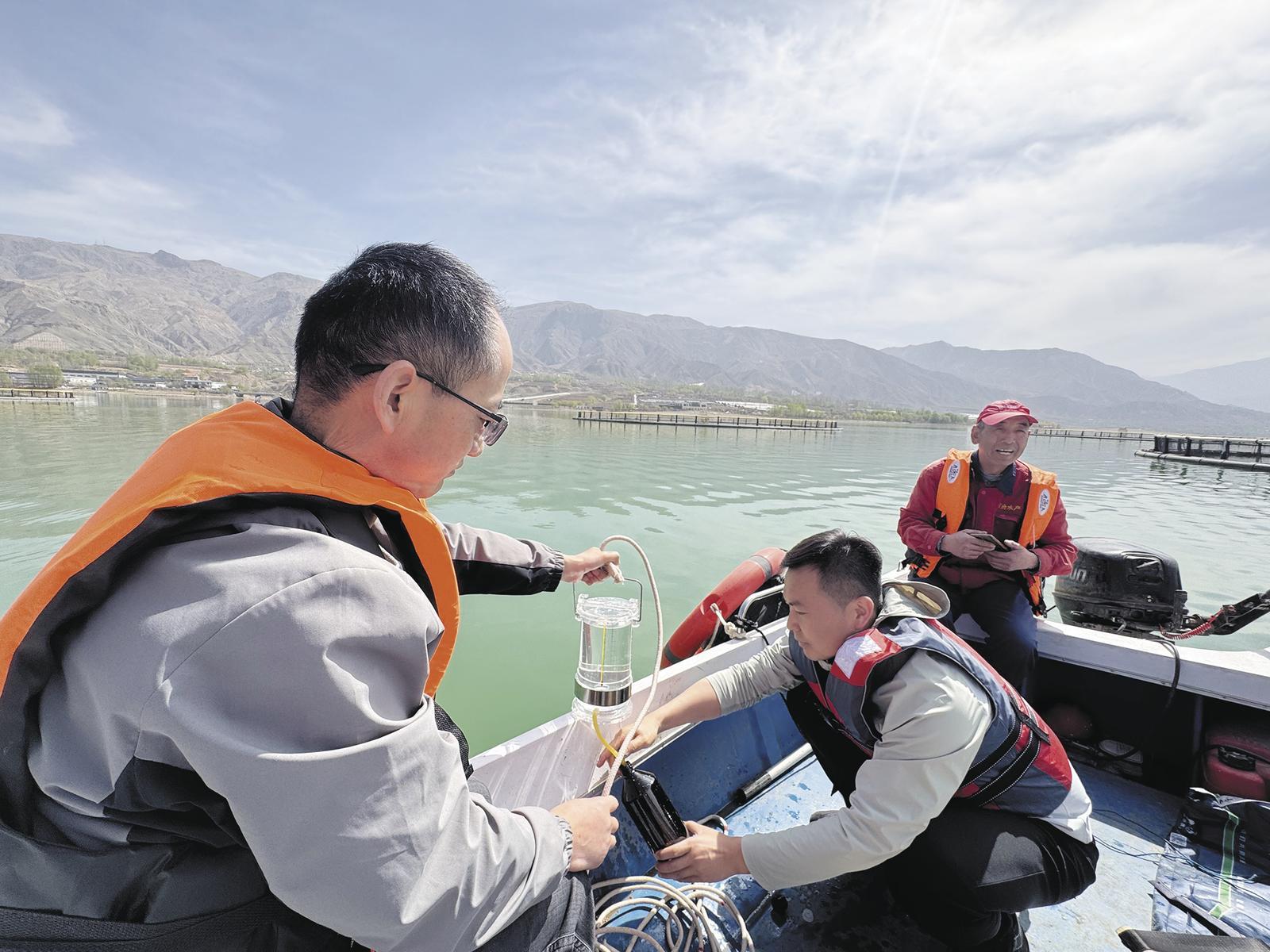 尤宏?duì)帲ㄖ校ьI(lǐng)尖扎縣水產(chǎn)養(yǎng)殖服務(wù)中心技術(shù)人員在對(duì)青海聯(lián)合水產(chǎn)集團(tuán)有限公司網(wǎng)箱養(yǎng)殖水環(huán)境進(jìn)行采樣。受訪者供圖