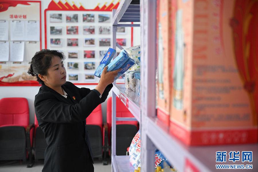 4月13日,才堂村黨支部書記胡海英正在整理“積分超市”的獎品。新華社記者 張龍 攝