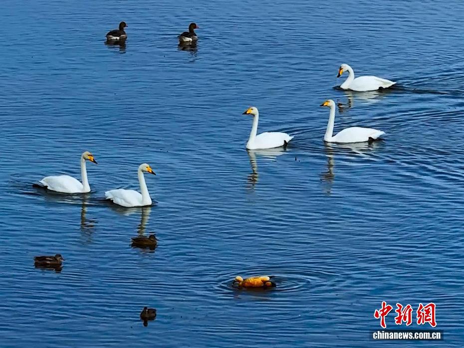 圖為水鳥在湖面游弋。(無人機(jī)照片)才新木加 攝
