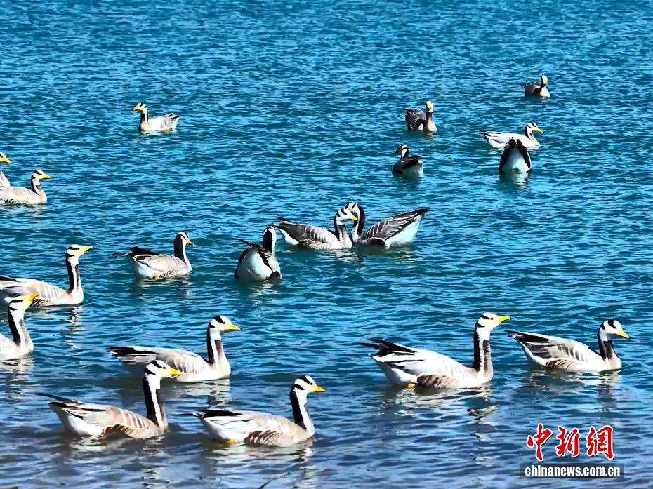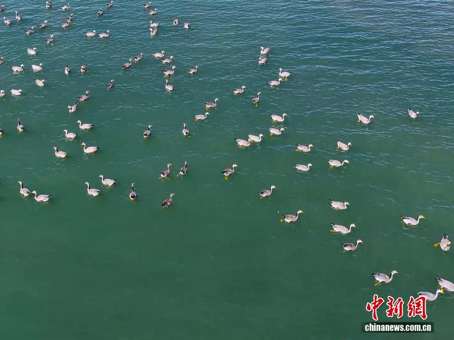 圖為斑頭雁在湖面游弋。(無人機(jī)照片)才新木加 攝