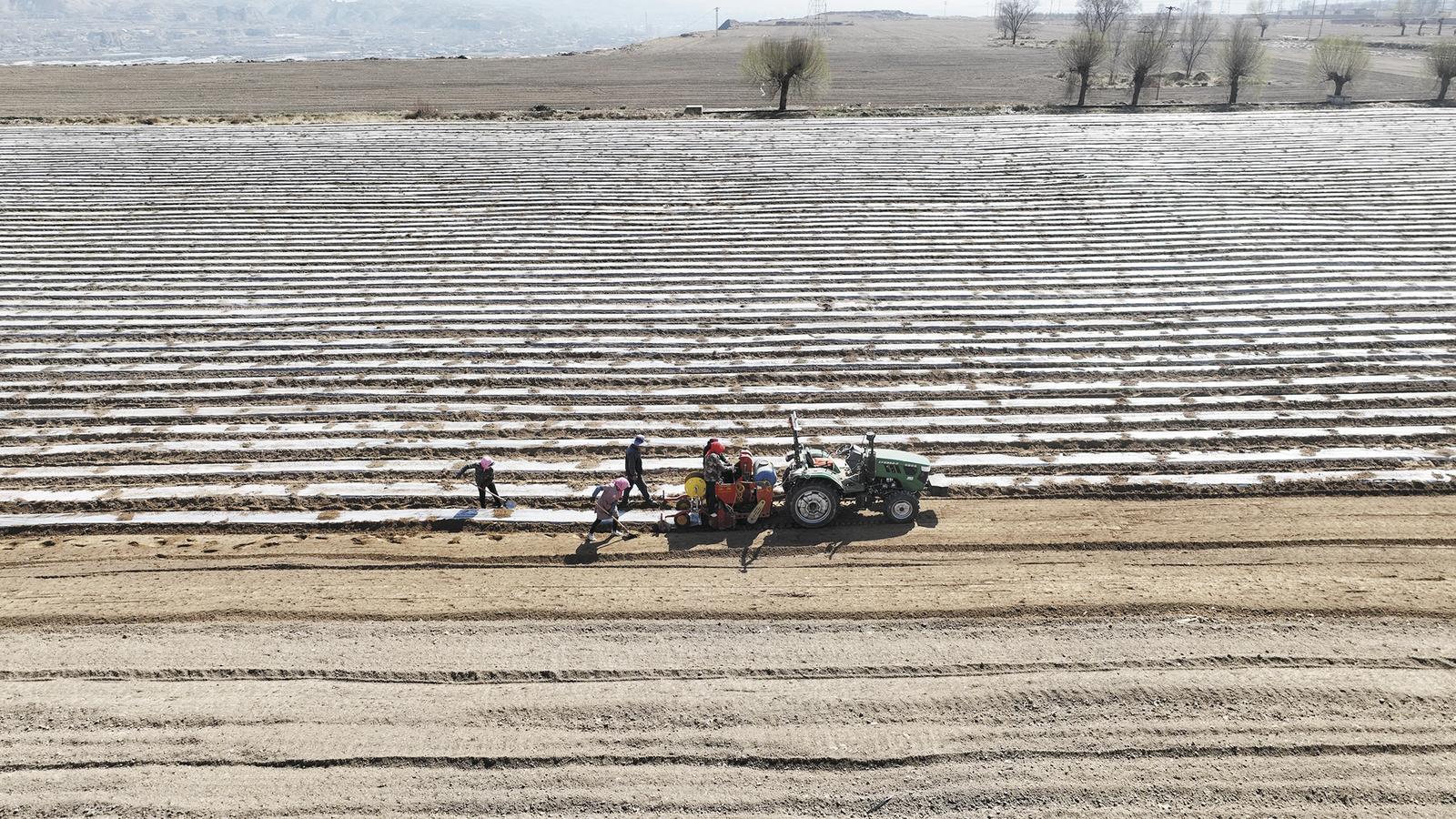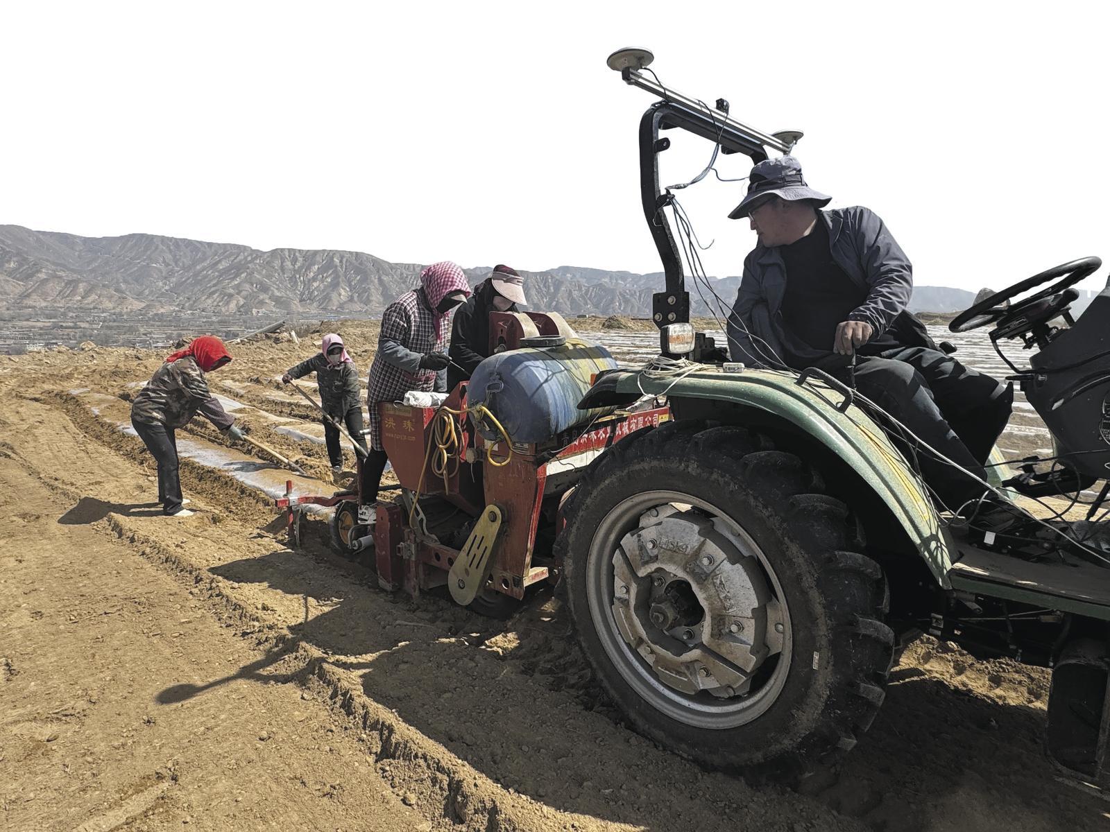 地頭上,李善俊蹲下身,在播種機試鋪的一小段地膜邊緣扒開泥土,用指尖探入,確認滴灌設備的埋設深度,確保無誤后再正式開工。