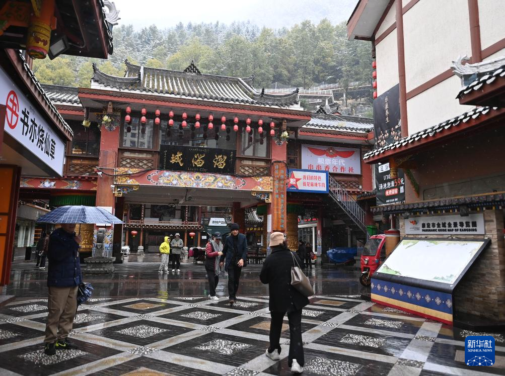 11月1日,游客冒雪在四川省甘孜州康定市溜溜城游覽。