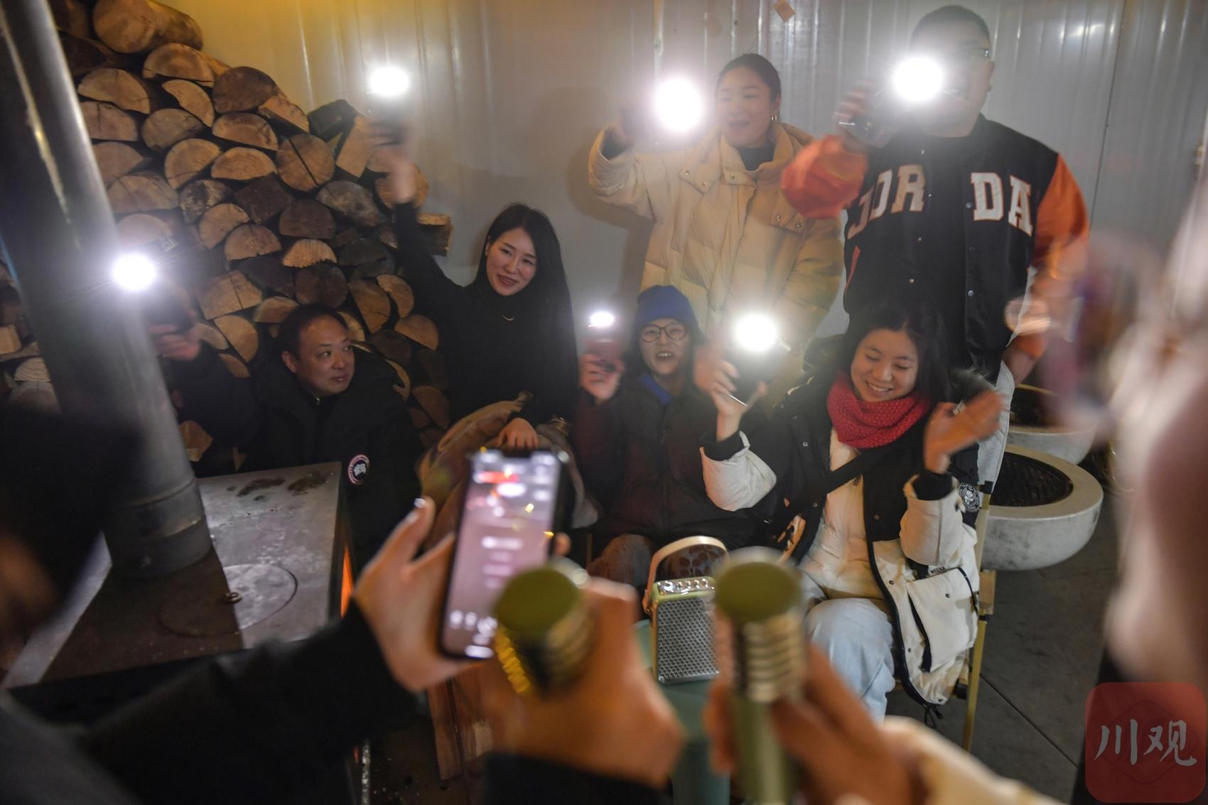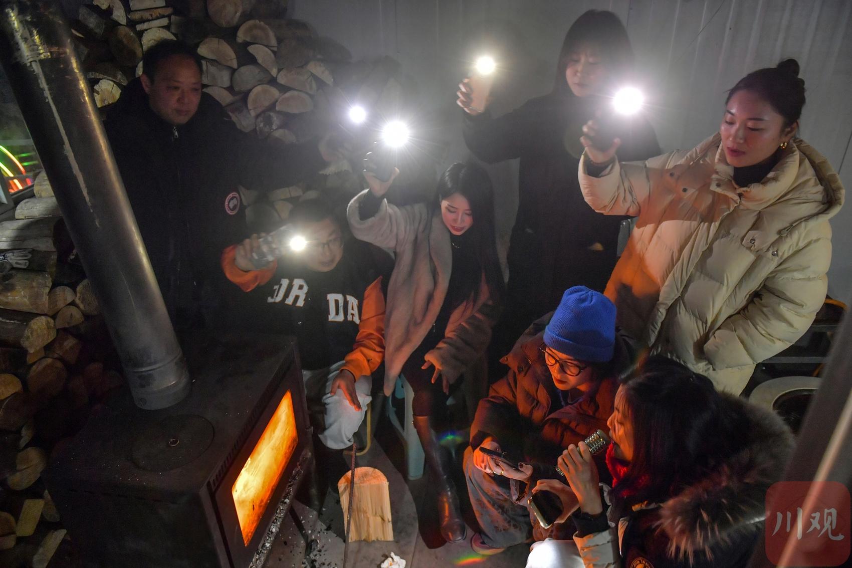 2025年12月17日晚,游客在四川省甘孜藏族自治州瀘定縣興隆鎮(zhèn)化林村海拔2080多米的星空房娛樂。李向雨 攝