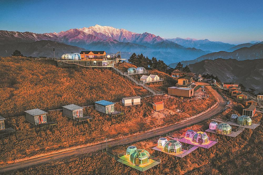 12月18日清晨,在甘孜州瀘定縣興隆鎮(zhèn)化林村,海拔2080多米的星空房與遠(yuǎn)處巍峨的雪山共同構(gòu)成壯美的冬景?! ?68_01B_20251223