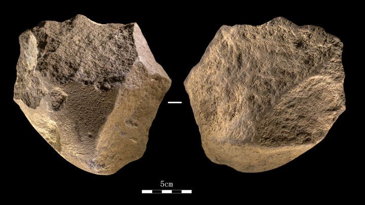這是2022年10月6日拍攝的皮洛遺址重要遺物——手斧。新華社發(fā)(四川省文物考古研究院供圖)