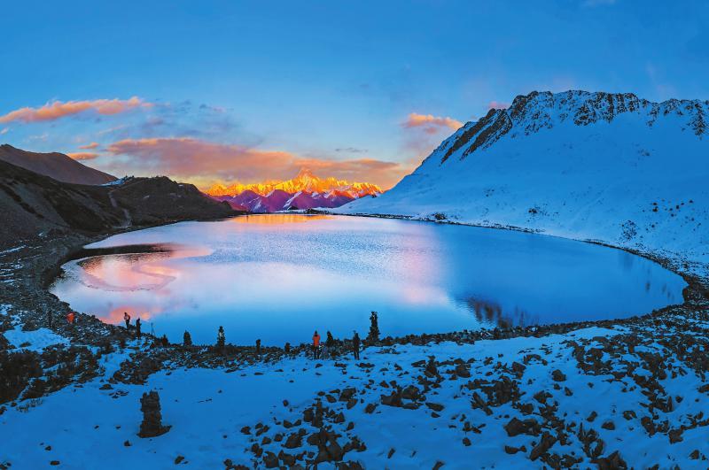 游客在康定市沙德鎮(zhèn)觀德結(jié)湖觀賞日照金山。本組圖片由 鄒麗君 攝